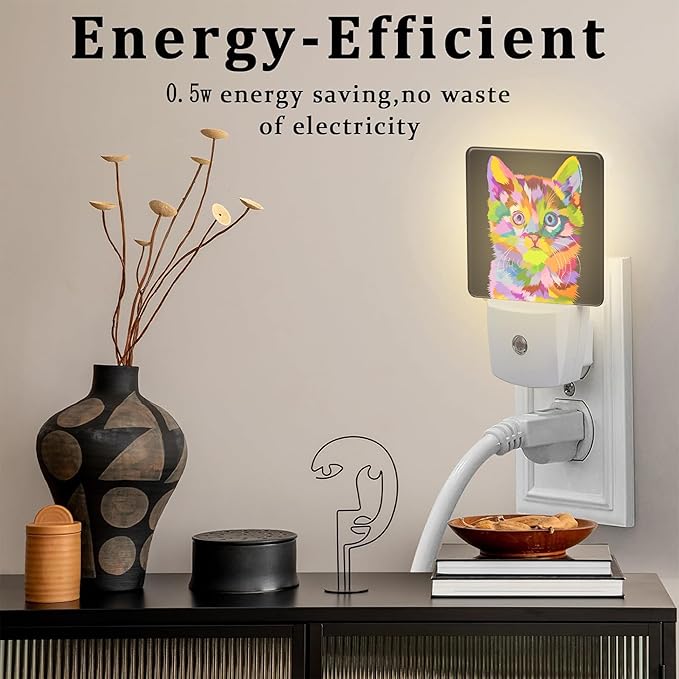 Cat on Pop Art Night Light Plug into Wall, Cute Colorful Cat Dusk to Dawn Night Light, 0.5w Energy Saving Sleep Friendly Nightlights for Kids Boys Girls Home Decor
