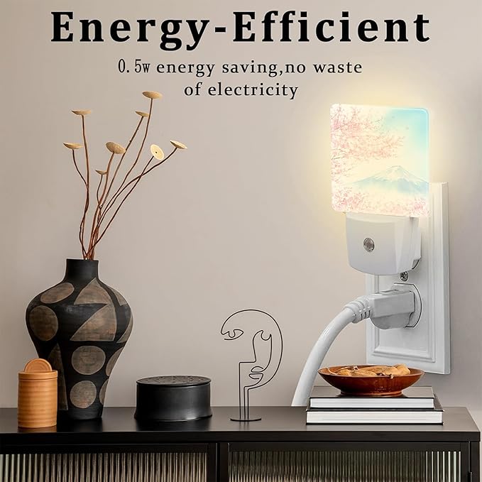 Cherry Blossoms with Mountain Fuji Night Light Plug into Wall, Watercolor Pink Flowers Dusk to Dawn Night Light,0.5w Energy Saving Sleep Friendly Nightlights for Kids Boys Girls Home