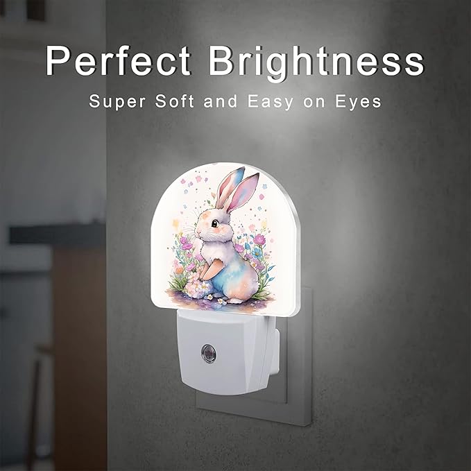 Easter Bunny and Flowers Night Light, Watercolor Cute Rabbit and Floral Dusk to Dawn Night Light Plug in,0.5w Energy Saving Sleep Friendly NightLight for Kids Boys Girls Home Decor