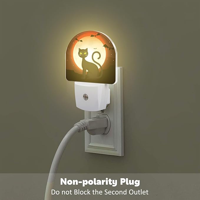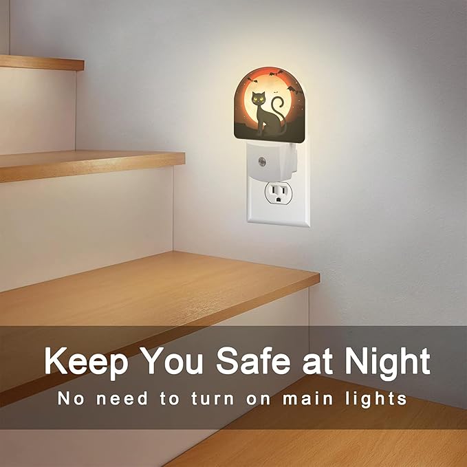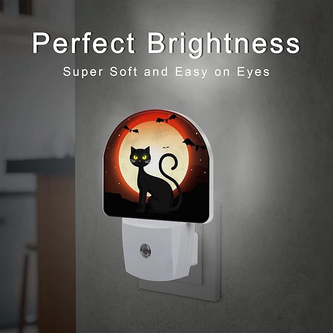 Black Cat with Full Moon Night Light, Halloween Cat Bats Dusk to Dawn Night Light Plug in,0.5w Energy Saving Sleep Friendly NightLight for Kids Boys Girls Home Decor