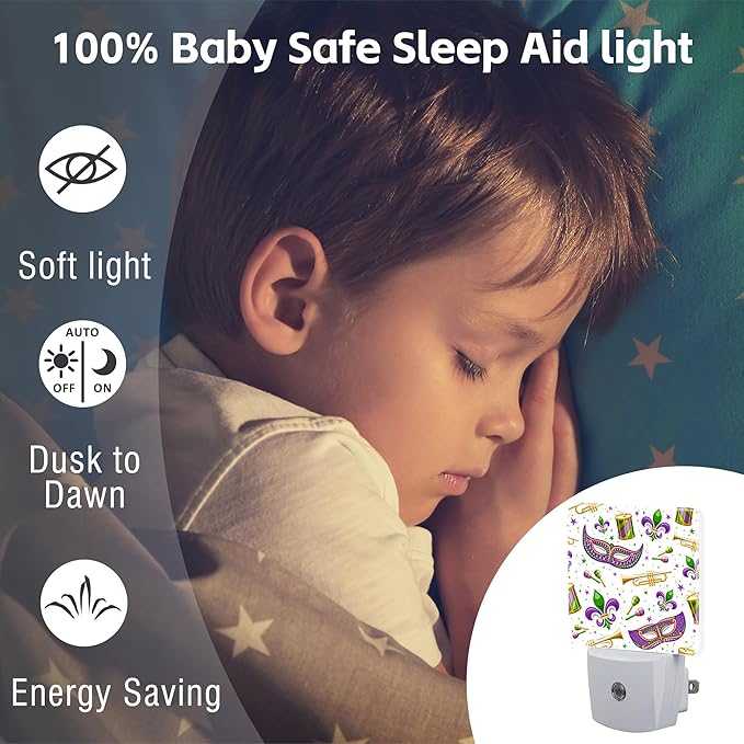 Mardi Gras Carnival Night Light, Fleur De Lis Mask and Musical Instruments Dusk to Dawn Night Light Plug in,0.5w Energy Saving Sleep Friendly NightLight for Kids Boys Girls Home Decor