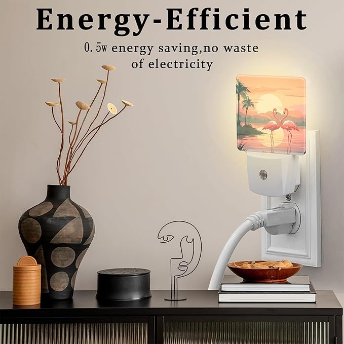 Pink Flamingos at Sunset Night Light for Kids,Summer Beach Tropical Palm Tree Night Light Plug in with Dusk to Dawn Sensor,0.5w Energy Saving Nightlight for Hallway Stairway Kitchen Bedroom