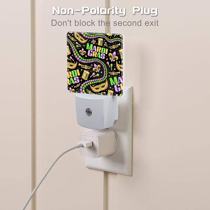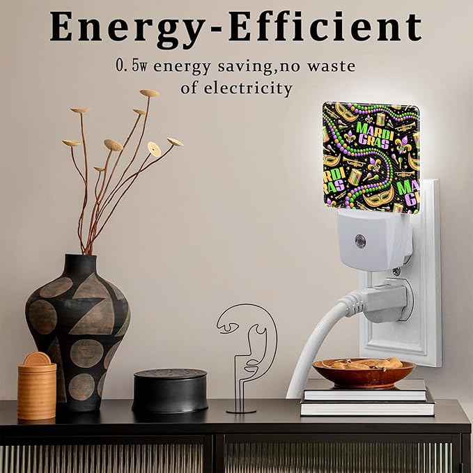 Happy Mardi Gras Night Light, Carnival Fleur De Lis Mask Beads Dusk to Dawn Night Light Plug in, 0.5w Energy Saving Sleep Friendly Nightlights for Kids Boys Girls Home Decor
