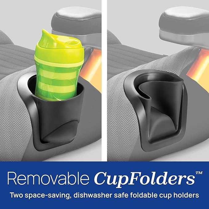 - EASY CARE — The GoFit ClearTex Plus portable booster seat features 2 dishwasher-safe, fold-away cup holders, a machine-washable seat pad and pop-out armrest covers for easy cleaning. The foam insert may be hand rinsed and hung to dry.