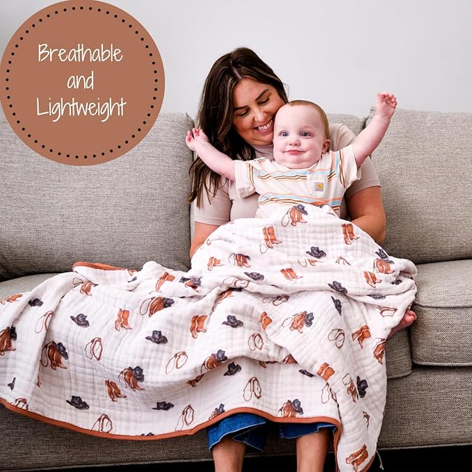 LollyBanks Muslin Baby Blanket 100% Organic Cotton, Muslin Quilt Lightweight, Toddler Blanket for Boys, 6 Layers Baby Blankets 47"x 47", Nursery Receiving Blankets Baby Essentials (Cowboy Print)