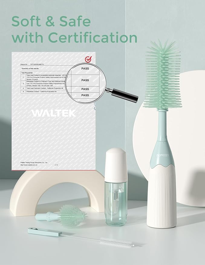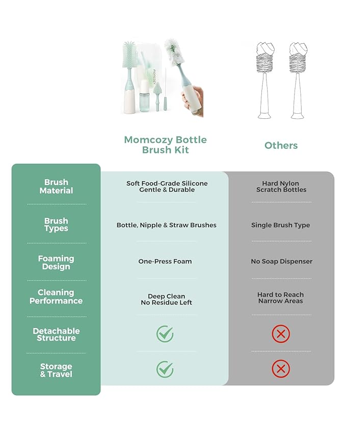 - Versatile Cleaning Tools - Momcozy bottle brush set includes different brush heads to cater to various cleaning needs: bottle brush head for bottles and breast pumps, angled brush head for teats, and silicone tube brushes for narrow openings like straws.