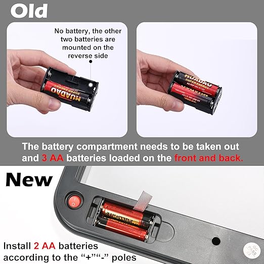 - NOTICE:The product you receive may be either our new or previous model. The new model uses 2 AA batteries, while the previous model requires 3 AA batteries. For the previous model, please remove the battery compartment and install 3 AA batteries in both the front and back. Both versions function the same and deliver the same performance, so you can use your product with confidence