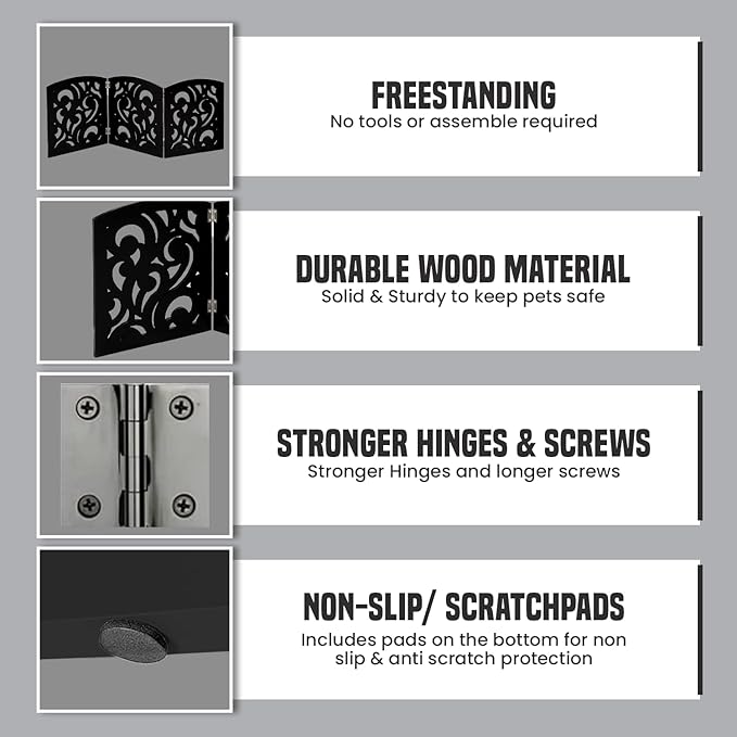 - MODERN DESIGN SELECTION - We carry multiple decorative designs for our freestanding pet gate collection, to blend well with any room decor. The Patterned cut outs look classy and ideal for its purpose.