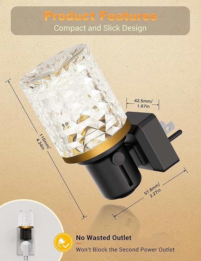 - Crystal Clear Design: This plug in night light features a high-quality cut crystal lampshade design. When illuminated, it casts enchanting light patterns, making it not just a lighting tool but also an exquisite home decor piece.