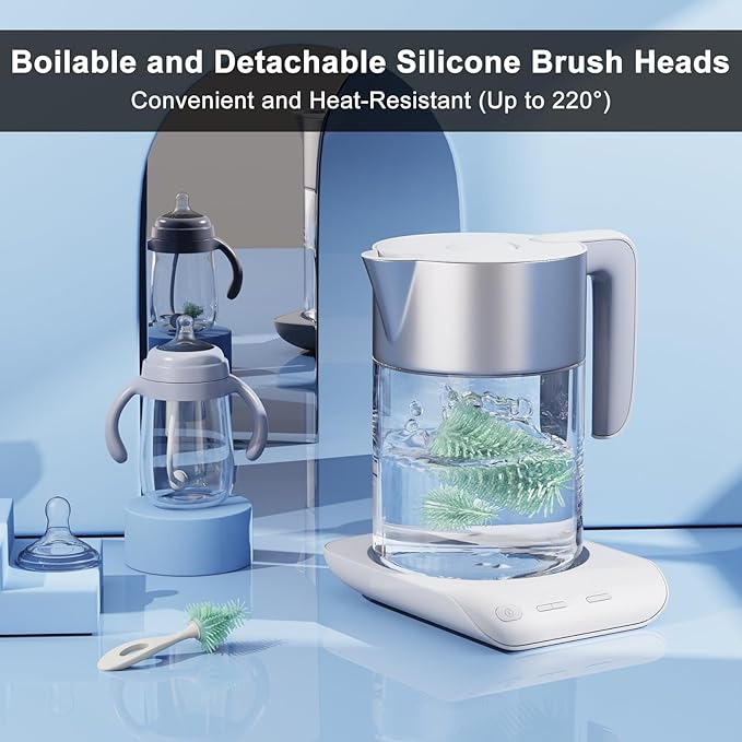 - UPGRADED BOTTLE BRUSH SET: This 3-in-1 silicone cleaning system combines a 11.8-inch extended handle for deep access to narrow bottles with a flexible bristle head that contours to curved surfaces and intricate nipple grooves. The integrated storage stand keeps brushes upright for hygienic air-drying while maximizing countertop space, paired with a hanging hook for vertical storage convenience.