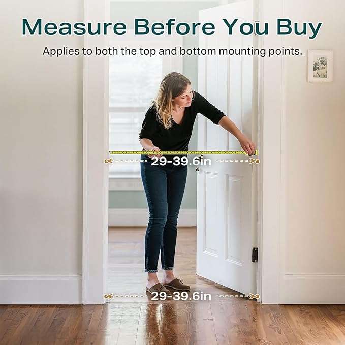 - Enhanced Safety for Babies and Toddlers – Our extra-tall baby gate is adjustable from 29” to 39.6” in width (39.6” includes the extension piece) and stands at 36” in height. This ensures comprehensive coverage for blocking access to stairs, bedrooms, hallways, or other areas of your home. Its versatile fit makes it ideal for standard U.S. doorways (30–36”), kitchen entrances, hallways (up to 39.6”), and most stairway openings.