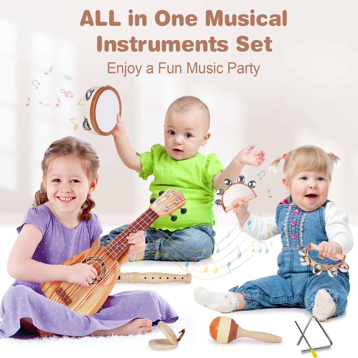 • 7-Piece Musical Toys: Vanplay kids guitar toys set provides children with a complete musical experience with 7 musical instruments: ukulele, maracas,tambourine, flute, castanets, triangle, hand bells. Multi-toy to keep your kids busy and happy, while stimulating the child's curiosity and desire to explore the world of music!