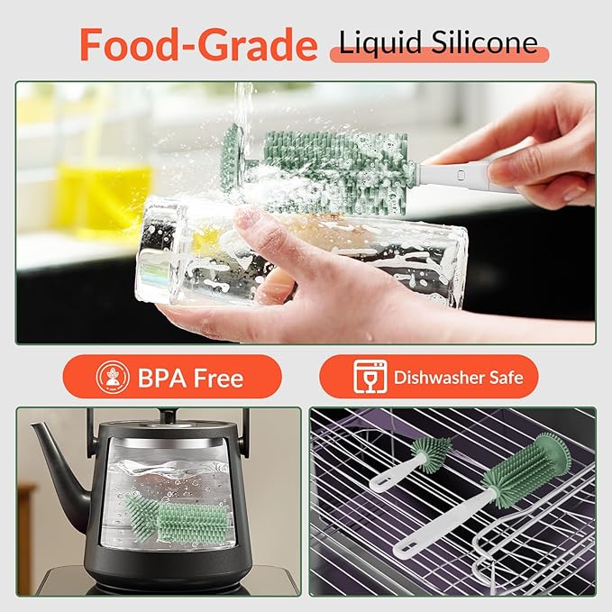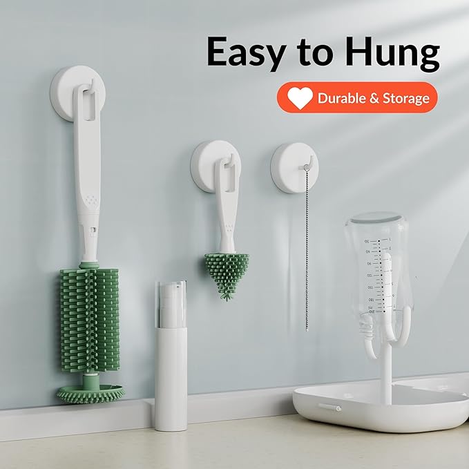 - Food Grade Material: The brush head of the silicone baby bottle brush and nipple brush is made of food grade silicone, safe and durable, BPA free.The brush head can be boiled and sterilized to give parents peace of mind. The large detachable handle silicone baby bottle brush has a top brush head and a side brush head, which can clean the bottom and the body of the bottle and water cup separately. Pair it with baby bottle nipple brush and straw brush for a comprehensive bottle cleaning