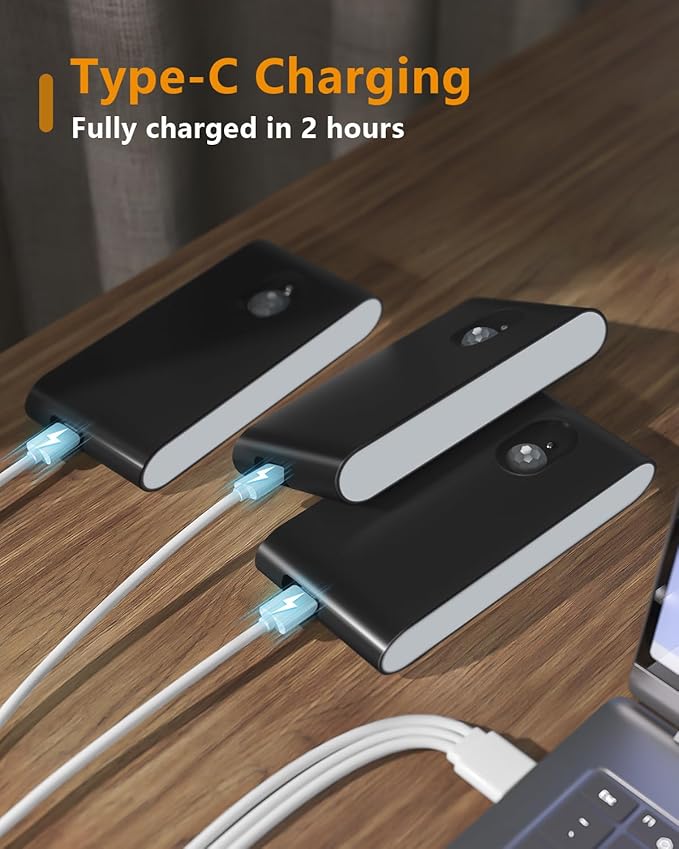 - [Rechargeable & Energy Saving] - The stair lights indoor has a built-in 500mAh large rechargeable battery, no need to buy extra batteries, environmentally friendly. In always-on mode, our motion sensor night light can be used continuously for 16 hours. In motion sensor mode, they can be used for up to 2 months. Charge 3 night lights at the same time with 3 in 1 Type-C cable, super convenient and saving up to 80 AA dry cell batteries per year per light.