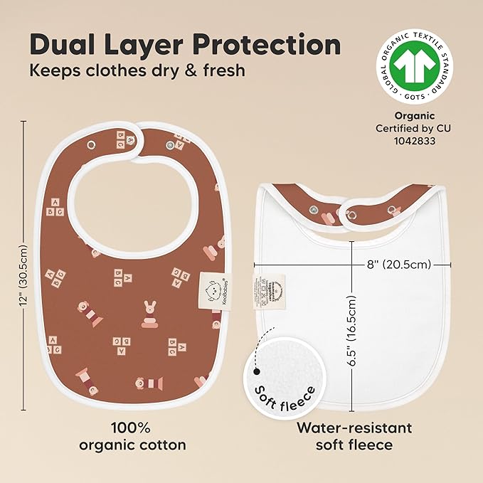 - Super Absorbent - Our organic baby boy and girl bibs are made with 100% organic cotton (GOTS-certified) and backed with water resistant fleece for added absorption. This dual layer design helps to keep your baby clean and fresh all day long. Suitable for newborns, infants, toddlers, heavy droolers and teething babies.