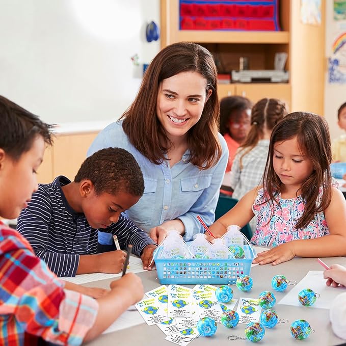 - Plenty of Children's Globe Keychains: our globe keychain set includes 50 globe squeeze ball keychains, 50 storage bag, and 50 earth themed thank you cards; The globe stress balls are 2 inches in diameter, making them very portable; The pouches are a good size for easy storage; And the thank you cards are beautifully designed to add a thoughtful and personalized touch to your gift giving