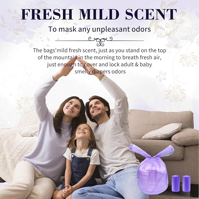 - 【Durable & Easy to Tear 】 Leak proof purple Diaper Sacks , with Easy-To-Tie-Tabs and recycled plastic,healthy for Adults & Baby. With clear & tidy breakpoints, the diaper trash bags scented garbage bag allows be quickly and easily torn from the rolls, quickly disposable feminine and incontinence products scented garbage bags.