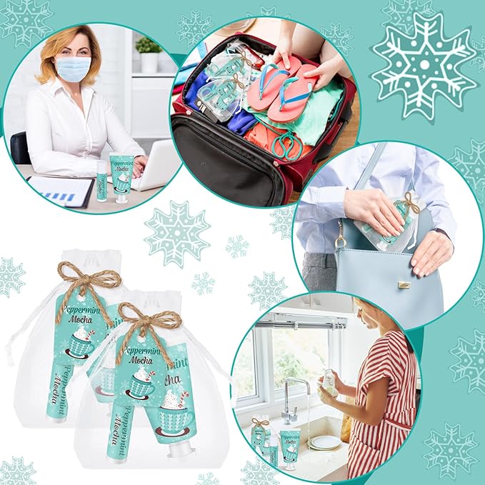 - Attractive Hand Cream Set: our peppermint mocha hand cream is an ideal gift for Christmas parties; The aroma of Mocha provides comfort and tranquility, elevating your mood and revitalizing it; This set includes 24 hand creams, 24 lipstick, 24 organza bags and 24 thank you tags, which will provide sufficient quantity for distribution to your relatives in baby shower, bride shower and other activities