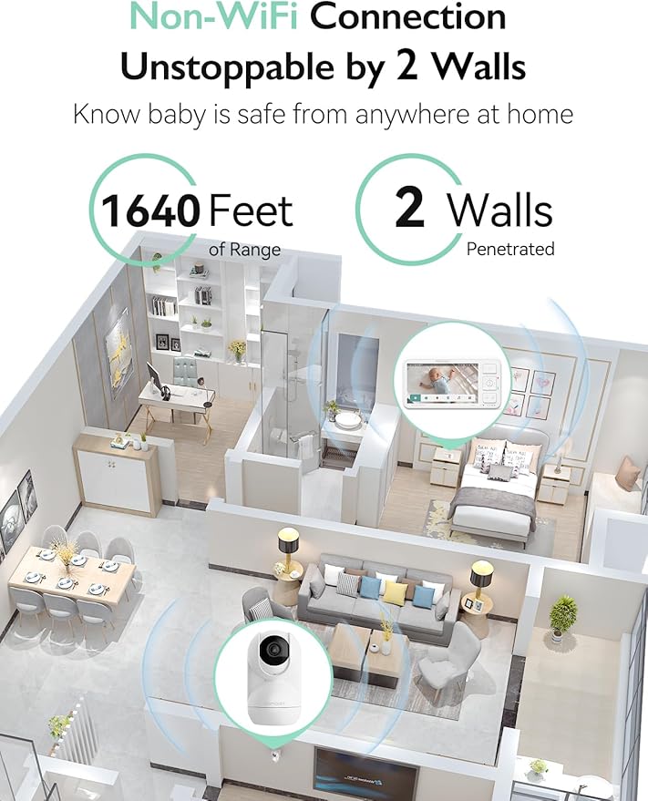 - 【Reliable Signal Without WiFi】Enjoy a strong and secure connection up to 1640 feet (500 meters) through multiple obstacles with the non-WiFi baby monitor. Featuring an FHSS closed-circuit system, your family's privacy is protected, as only you can access the feed. No WiFi needed, keeping your connection safe and secure.