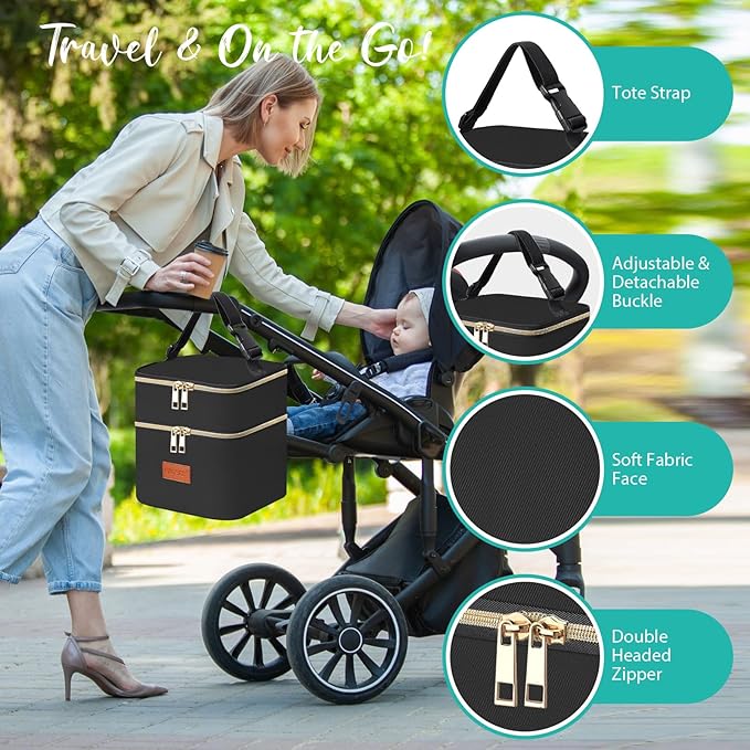 - Double Layer & Dual Compartment Design: The bottom cooler room with an ice pack that will keep breastmilk, drinks, or baby food fresh for hours. And it can fits 4 large baby bottles up to 5 ounces. The top compartment layer provides some space and you can breastmilk storage bags, baby squeeze pouches, baby snack container box or baby food storage jars...