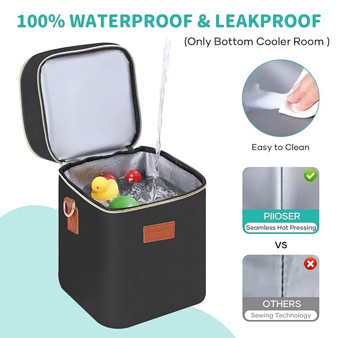 - Double Layer & Dual Compartment Design: The bottom cooler room with an ice pack that will keep breastmilk, drinks, or baby food fresh for hours. And it can fits 4 large baby bottles up to 9 ounces. The top compartment layer provides some space and you can breastmilk storage bags, baby squeeze pouches, baby snack container box or baby food storage jars...