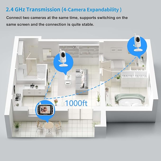 - Two-Way Talk and Long Transmission Range: The video monitor has a transmission range of up to 1000 feet. You can play 4 soothing lullabies or use the two-way talk-to-talk feature to comfort your baby.