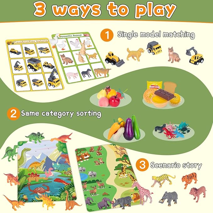 - 8 Theme Sorting Toy: This Montessori toy set includes: 9 x wild animals, 9 x dinosaurs, 9 x marine animals, 9 x domestic animals, 9 x construction vehicles (pull-back vehicles), 9 x fruits, 9 x vegetables, 9 x foods, total 72 fun toys, and 8 x activity cards. Each toy is vivid and cute.