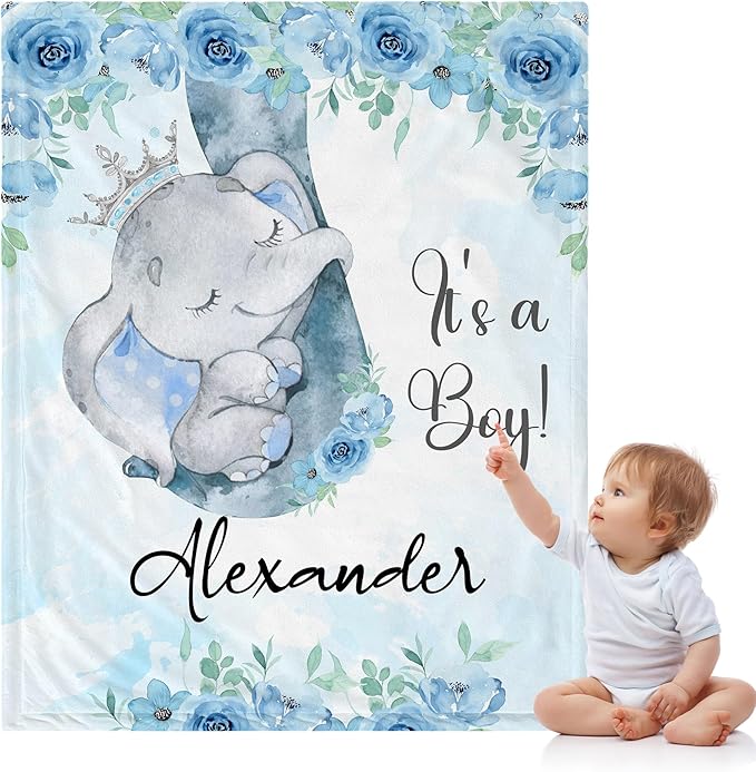 J&SBGFT Personalized Baby Blanket for Boys - Custom Name Receiving Blanket for Toddlers, Kids Nursery, Stroller, Crib Decor Throw - Elephant It's a Boy