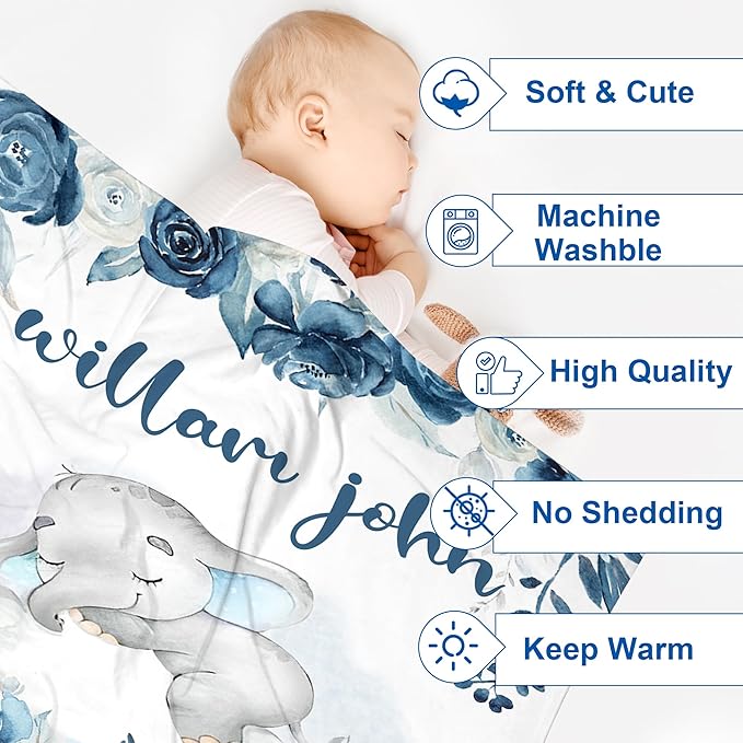 J&SBGFT Personalized Baby Blanket for Boys - Custom Name Receiving Blanket for Toddlers, Kids - Nursery, Stroller, Crib Decor Throw - Blue Elephant Sleeping
