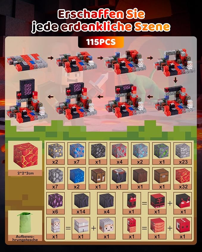 - Build Your Own Adventure World: Create your own unique volcanic landscape with 115 magnetic building blocks, Embark on an epic journey through volcanic lava and defeat dragons to explore a mysterious volcanic world.