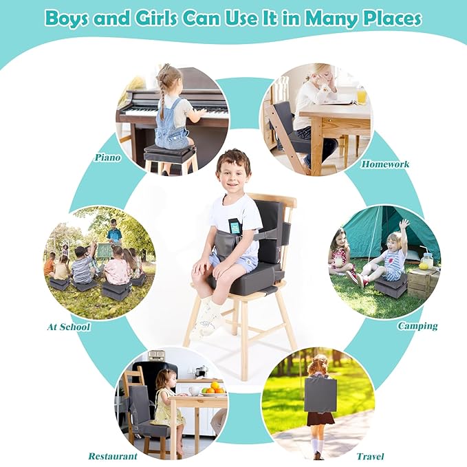 - [Unique Toddler Booster Seat] We added a piece of fabric to the adjustment belt to increase the contact area between the booster cushion and the chair, avoid tearing when pulling the product, and protect your chair more——Original design, patent No.:US D1,007,902 S
