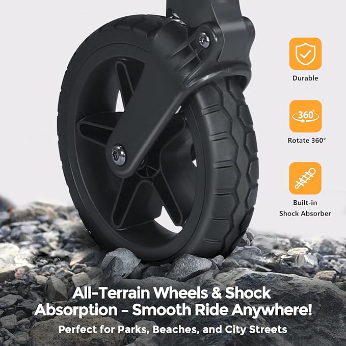- All-Terrain Maneuverability: Easily traverse any terrain! The sturdy rubber tires and 360° swivel front wheels easily navigate uneven sidewalks, grass, and sand. No matter where your adventures take you, you can push or pull comfortably thanks to the dual handlebars that can be adjusted