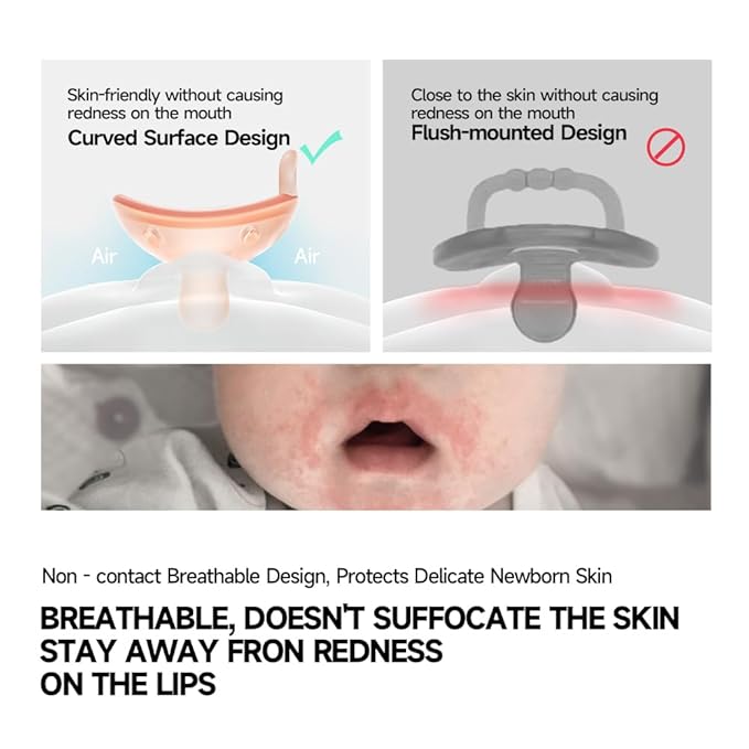 - KIND TO SKIN: The outward curve keeps the pacifier off their delicate skin, providing plenty of room for their nose, chin, and cheeks.
