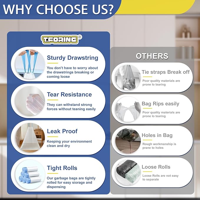 - 【Thick & Unscented】 Adopted the durable HPDE material, T.FORING small drawstring trash bags are sturdy, strong, and odorless. Durable and leak-proof, the 4 gallon trash bag is ideal for everyday use.