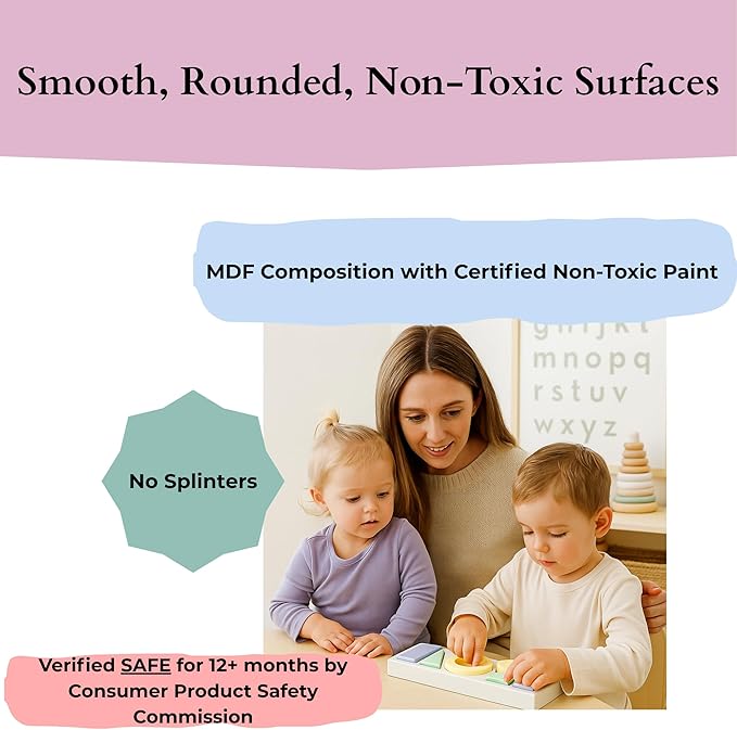 - CALMING, GENDER NEUTRAL COLORS: This toddler puzzle includes non-toxic, child-safe painted surfaces. The sturdy toy is coated in pretty colors of light yellow, light green, and lavender, which are gender neutral and easier for children with color blindness to detect differences among the hues. The calming colors help children focus for longer periods of time when using the toy.