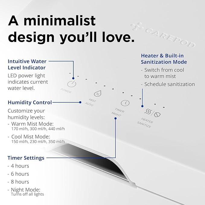 - HEALTHIER AIR WITH WARM OR COOL MIST: Experience cleaner, more breathable air with Carepod humidifier's ultrasonic mist technology. Choose between warm or cool mist to alleviate dry skin, improve sleep, and enhance your wellness in rooms up to 700 sq. ft.