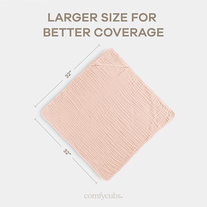 Comfy Cubs Hooded Baby Towel 2-Pack, Large 32 x 32 Inch - 6 Layer 100% Muslin Cotton for Babies, Toddlers and Kids - Soft & Absorbent Baby Bath Towels - Unisex Design for Bath Time - Blush