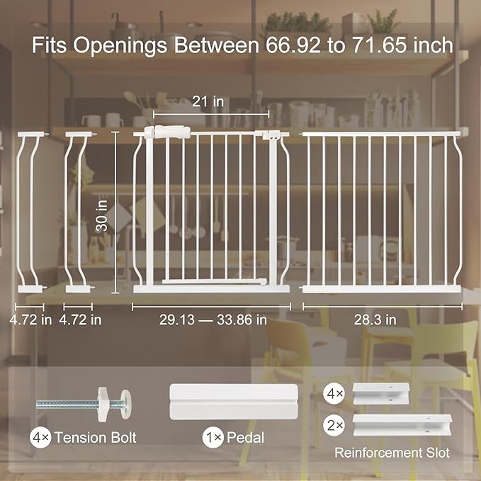 - Adjustable Baby Gate:Baby gates for dogs 30.5 inches tall, expands to fit openings 66.92-71.65 inches wide.21 inches swing door makes mothers easier to walk through while holding a baby.Please be sure measure your opening prior to purchase to ensure proper fit.
