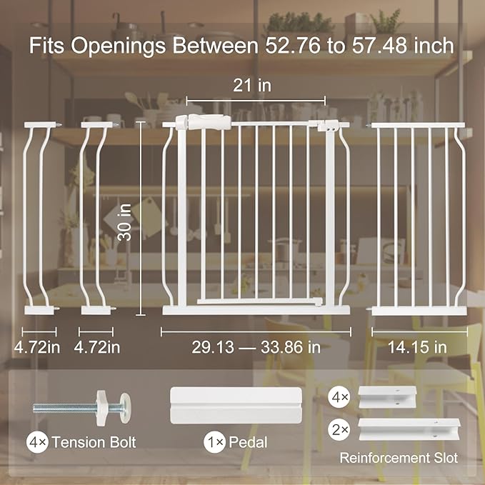 - Adjustable Baby Gate:Baby gates for dogs 30.5 inches tall, expands to fit openings 52.76-57.48 inches wide.21 inches swing door makes mothers easier to walk through while holding a baby.Please be sure measure your opening prior to purchase to ensure proper fit.