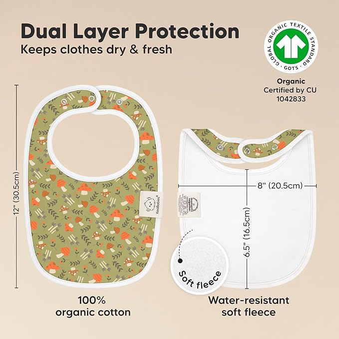 - Super Absorbent - Our organic baby boy and girl bibs are made with 100% organic cotton (GOTS-certified) and backed with water resistant fleece for added absorption. This dual layer design helps to keep your baby clean and fresh all day long. Suitable for newborns, infants, toddlers, heavy droolers and teething babies.