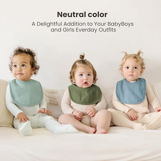 - Soft & Absorbent: These baby bibs are made with a 100% cotton muslin front and a polyester comfort fleece back for superior absorbency and a soft, skin-friendly feel. They effectively soak up drool and spit, keeping both you and your baby clean and dry-no more wet clothes