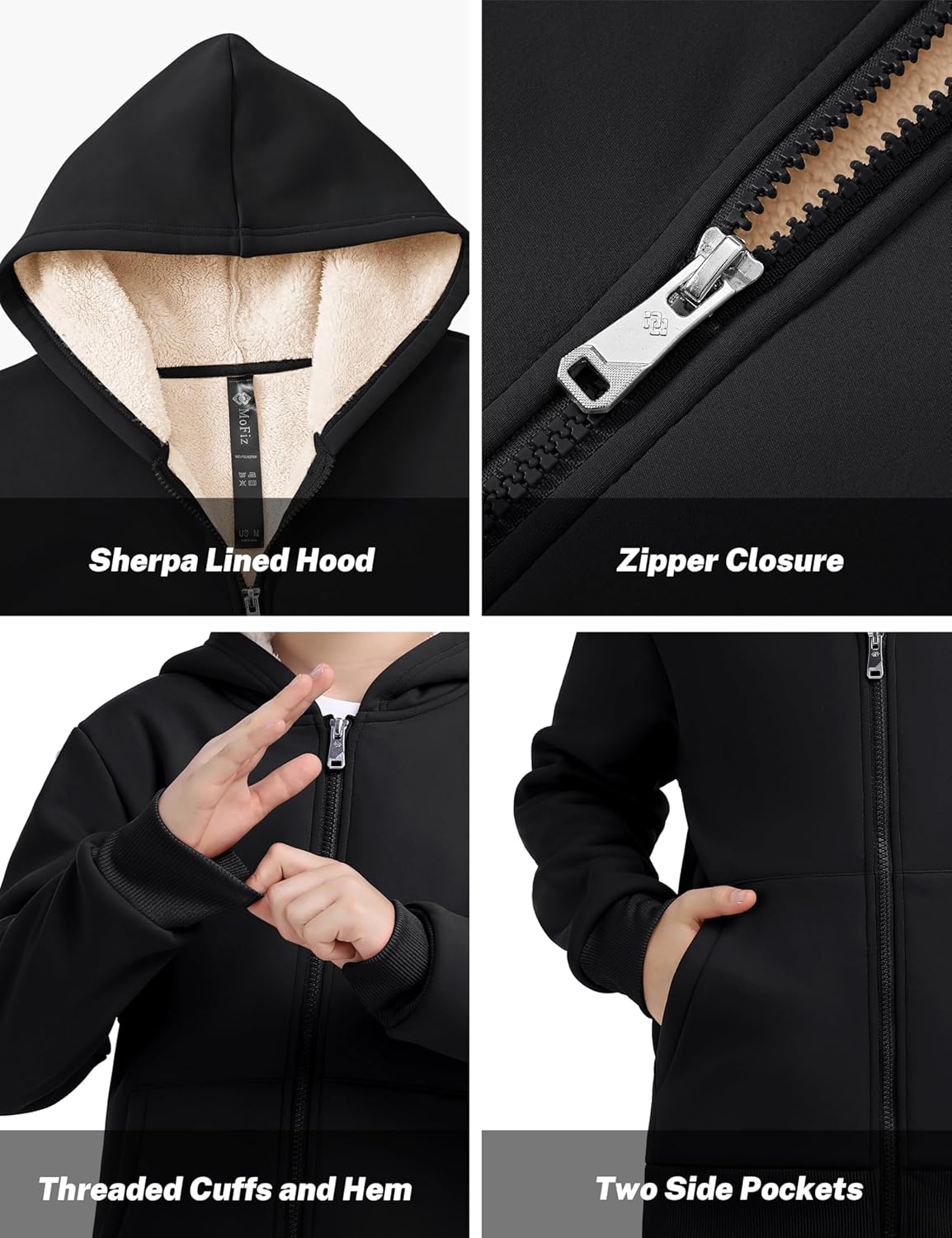 • 【Warm & Comfy】MoFiz Boys Girls Fleece Jacket is made of 100%Polyester, soft and durable outer shell and faux sherpa lined for softness and comfort. No pilling, no shedding, whether for daily wear or outdoor activities in cold weather, our sherpa lined zip up hoodie will keep your kids warm and cosy