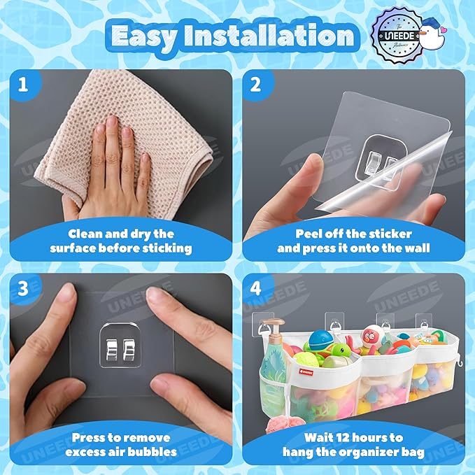 - 【Why We Choose Sticker But Not Suckers】Greater load capacity, longer to use.Unlike suction cups that tend to slip off due to too much humidity, the stickers stay firmly on the wall.It also offers a weight capacity of up to 22 pounds, allowing you to place more toys. For this reason we have prepared a detailed video & photo installation tutorial. It is convenient for you guys to be able to install the organizer in the exact location.