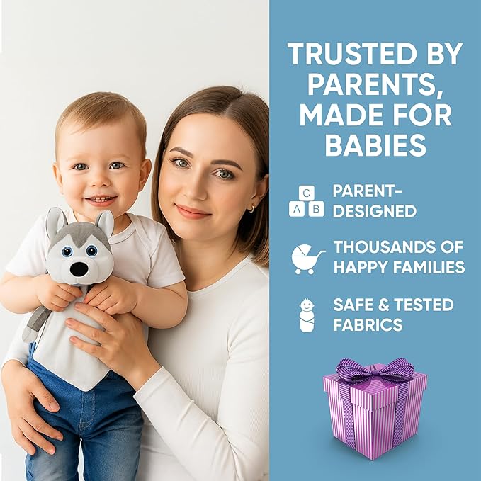 - White Noise with Heartbeat and Lullaby Options: Designed for convenience, this Husky baby sleep toy features in-ear buttons to play heartbeat sounds or lullabies and bedtime. Choose from two timer lengths (20 or 40 minutes) and volume settings. The built-in sound machine helps ease babies into rest by creating a soothing environment, ideal for naptime, bedtime, and travel.