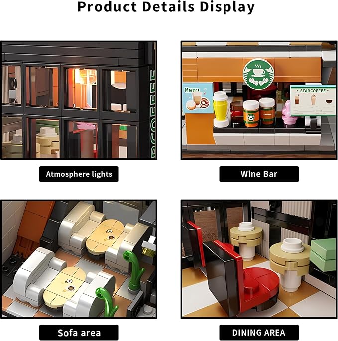 - Double-layered design, enjoy coffee time to the fullest: The ingeniously crafted double-layered coffee house building set integrates a coffee bar and a leisure sofa area on the first floor, allowing you to immerse yourself in the cozy aroma of coffee; The second floor is equipped with an elegant lounge that offers a private and relaxing space to fully experience the delicacy and comfort of the café.