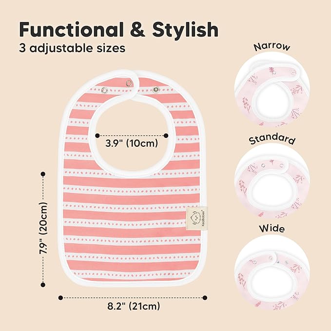 - 3 Adjustable Sizes With Soft Seams - With 2 sets of nickel-free snaps, you can adjust the girl and boy bibs according to your baby’s neckline. The soft-wrapped seams provide extra comfort for your baby while having the baby cloth bibs on.