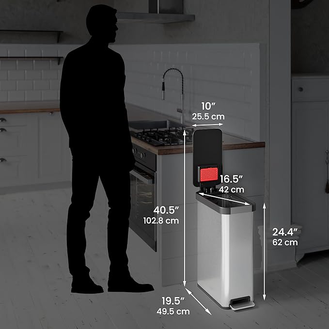 - HANDS-FREE STEP PEDAL - HYGIENIC & CONVENIENT — Open the lid with a simple press of the foot pedal, reducing contact and promoting a cleaner environment in kitchens or shared areas.