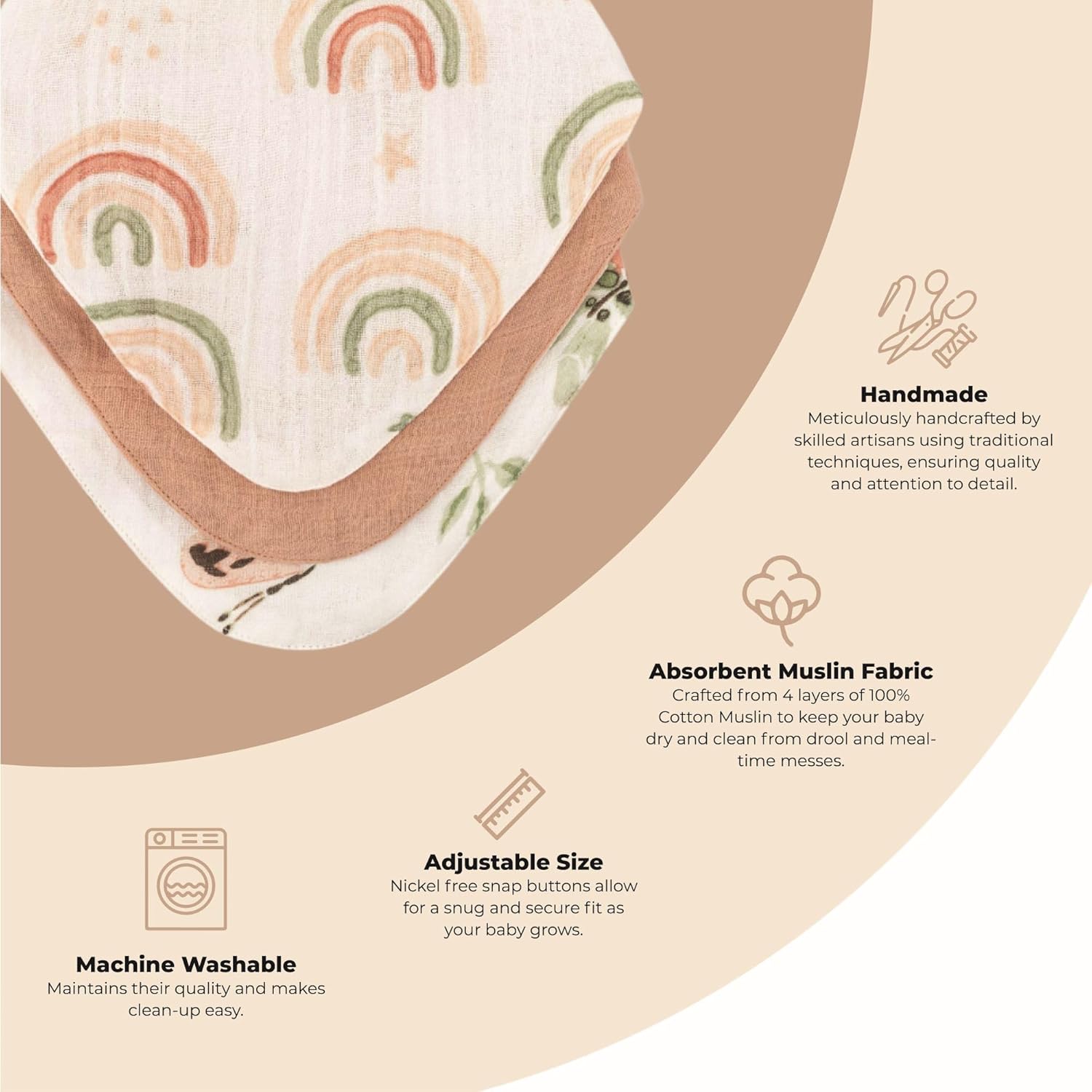 - Soft Yet Durable - Our cotton muslin bibs blend expert, handmade craftmanship with high-quality, durable materials for a soft and durable baby bib, as well as ethically and sustainably sourced
