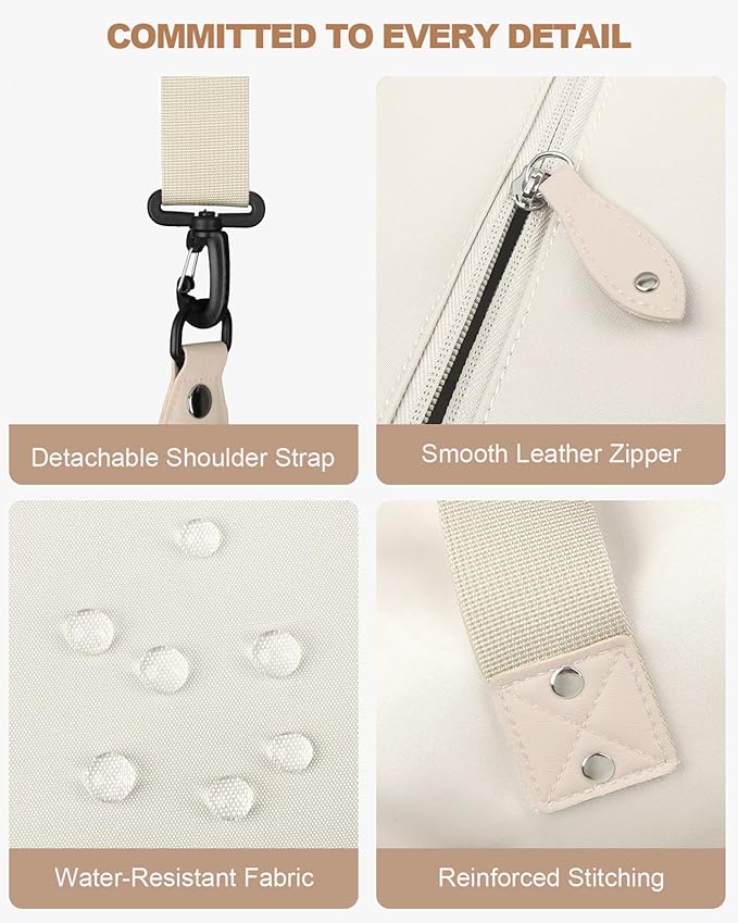 - Committed to Every Detail: Featuring a removable, adjustable shoulder strap for customizable comfort. It ensures effortless access with a smooth leather zipper. Crafted from water-resistant and tear-resistant polyester fabric, it keeps your belongings safe from unexpected splashes and rain, while reinforced stitching guarantees long-lasting use. The innovative snap feature expands capacity by up to 10%, adapting to your packing needs. Elevate your travel experience with our gym bag for women
