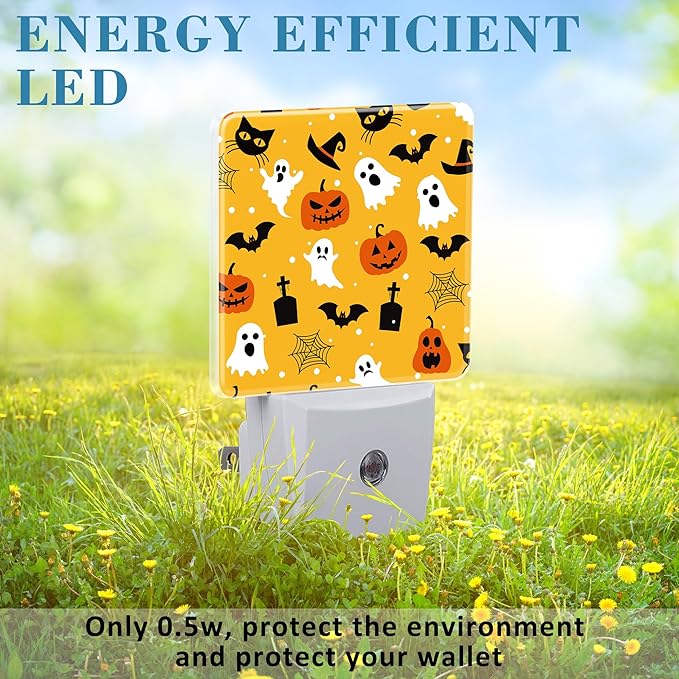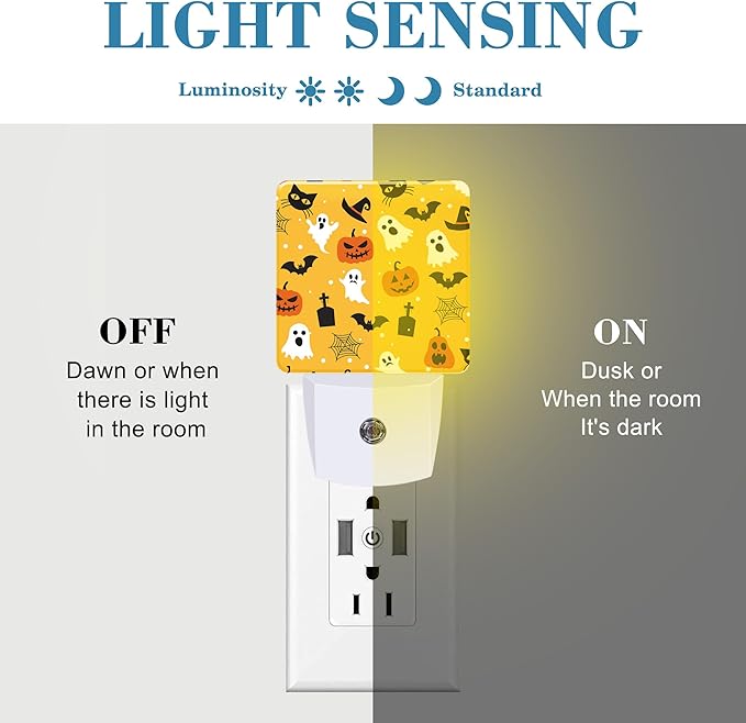 - [Dusk to Dawn Sensing]: Halloween Pumpkin Bat Black Cat and Ghost Night Light equipped with a dusk to dawn sensing function, it will automatically turn on at night or in a dimly lit environment, and automatically turn off in the morning or in sufficient light. This smart sensor design saves power and is convenient, so you don't need to switch manually.